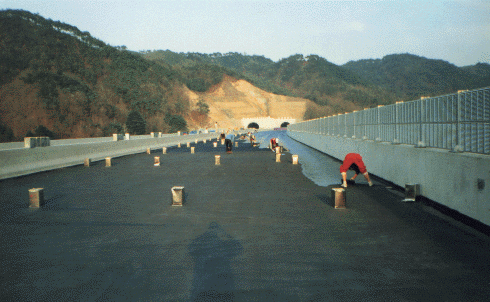 콘크리트 상판의 방수층은 통과차량에 의한 거듭되는 하중, 진동, 충격, 전단 등의 역학적 작용, 외기온도 변화등의
