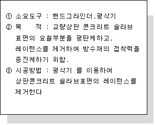 2) 방수재는 콘크리트 상판에 물이나 염분이 침투하는 것을 방지하기 위해 설정하는 것으로 불투과성은 물론이며,